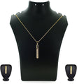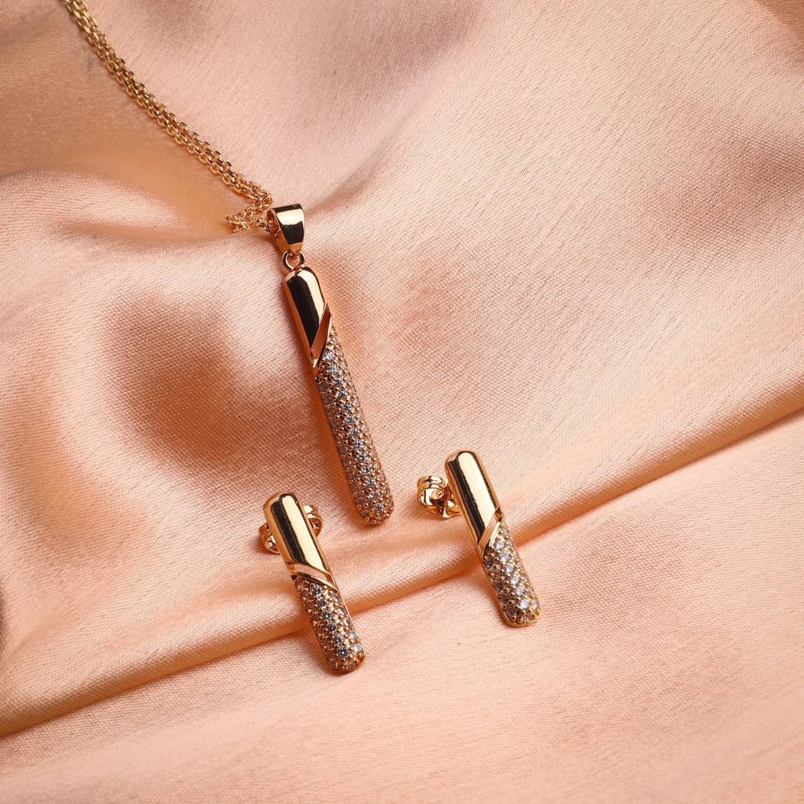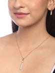 - This rose gold necklace features a sleek and small stick-shaped pendant with diamond studding, hanging from an elegant and delicate chain. The design is simple yet stylish, making it perfect for both casual and formal occasions.